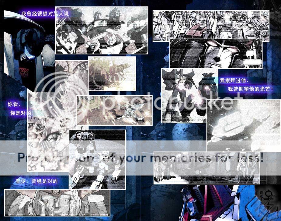 Starscream尖声嚷道:“你错了!我没有偏离话题——我正要告诉你那个勇士的名字!我崇拜过他,我曾仰望他的光芒!他意志坚定,他蔑视因循守旧的制度,他俨然是一个崭新世界的化身!他给了所有因清醒而无比疼痛的塞伯坦人以新生的希望!”